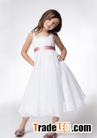 A-line Wide Straps Tea-length Taffeta Lace Ribbons Flower Girl Dress